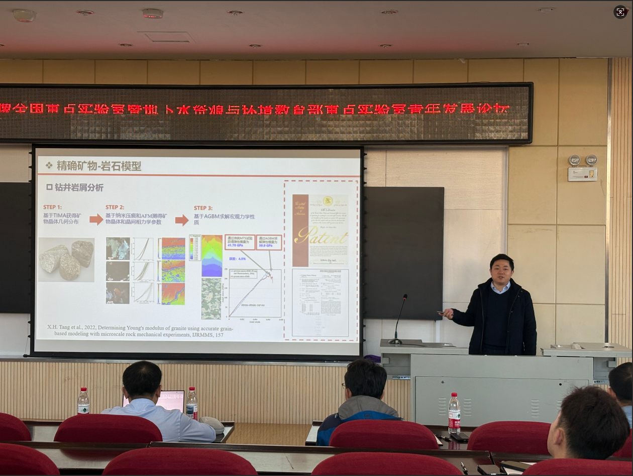 主持人袁益龙教授分享了“深部多尺度复杂裂隙储层水热运移模型与应用”。报告针对深部地热、油气储层中裂隙网络的非均质性特征,建立了多尺度耦合的水热运移数值模型,精准刻画了流体流动与热量传递规律,为深部资源高效开采与储层稳定性评估提供了理论支撑。